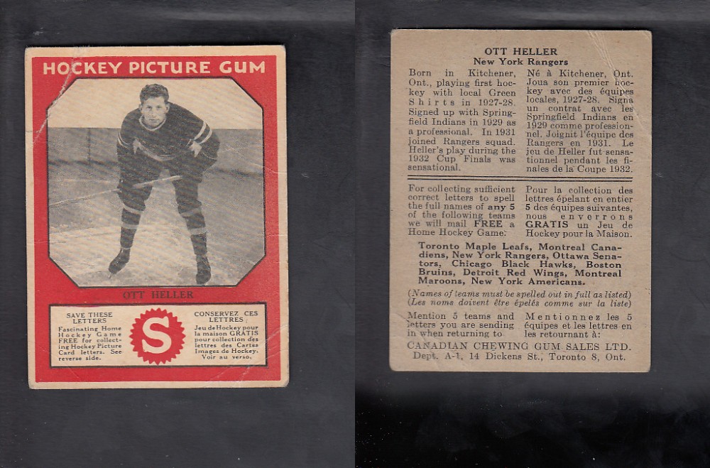 ITEM# : CS63300902 1933-34 CANADIAN CHEWING GUM HOCKEY CARD O. HELLER DESCRIPTION 1933-34 CANADIAN CHEWING GUM HOCKEY CARD O. HELLER CONDITION VG CREASES PRICE $49.99 USD SHIPPING CANADA RESIDENT 3.00$