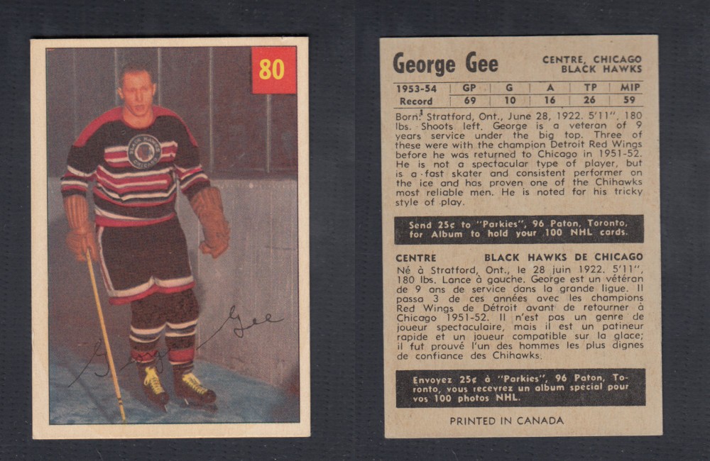 ITEM# : CS65004851 1954-55 PARKHURST HOCKEY CARD #80 G. GEE DESCRIPTION 1954-55 PARKHURST HOCKEY CARD #80 G. GEE CONDITION VG - 1 SMALL CREASE PRICE $9.99 USD SHIPPING CANADA RESIDENT 3.00$