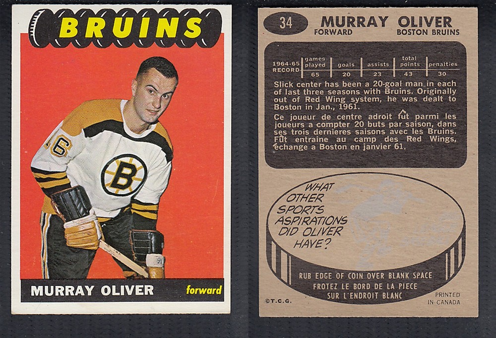 ITEM# : CS65329376 1965-66 TOPPS HOCKEY CARD #34 M. OLIVER DESCRIPTION 1965-66 TOPPS HOCKEY CARD #34 M. OLIVER CONDITION EX/MINT NO CREASE PRICE $9.99 USD SHIPPING CANADA RESIDENT 3.00$