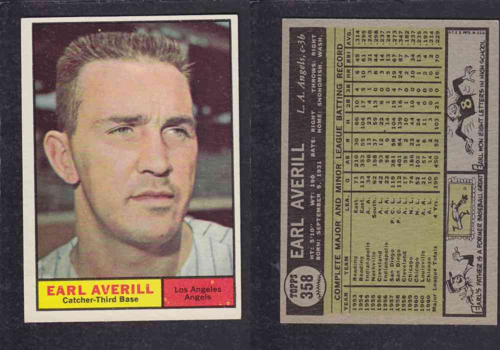 ITEM# : CS67646876 1961 TOPPS BASEBALL CARD #358 E. AVERILL DESCRIPTION 1961 TOPPS BASEBALL CARD #358 E. AVERILL CONDITION EX/MINT NO CREASE PRICE $1.99 USD SHIPPING CANADA RESIDENT 3.00$