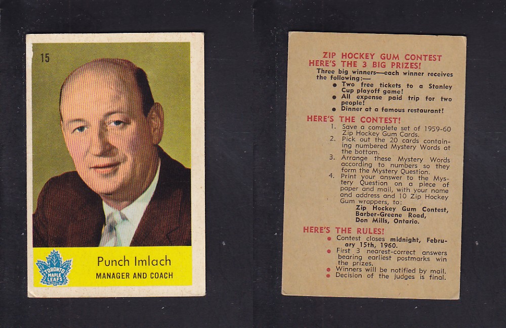 ITEM# : CS67952494 1959-60 PARKHURST HOCKEY CARD #15 P. IMLACH DESCRIPTION 1959-60 PARKHURST HOCKEY CARD #15 P. IMLACH CONDITION VG NO CREASE PRICE $11.99 USD SHIPPING CANADA RESIDENT 3.00$