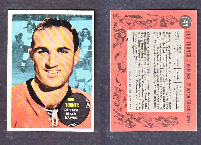 ITEM# : CS68803974 1961-62 TOPPS HOCKEY CARD B. TURNER # 41 DESCRIPTION 1961-62 TOPPS HOCKEY CARD B. TURNER # 41 CONDITION EX/MINT NO CREASE PRICE $11.99 USD SHIPPING CANADA RESIDENT $3.00