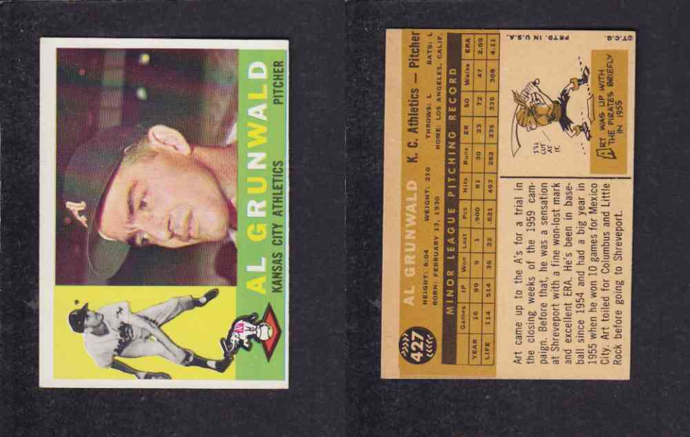 ITEM# : CS69352857 1960 TOPPS BASEBALL CARD #427 A. GRUNWALD DESCRIPTION 1960 TOPPS BASEBALL CARD #427 A. GRUNWALD CONDITION EX/MINT NO CREASE PRICE $1.99 USD SHIPPING CANADA RESIDENT 3.00$