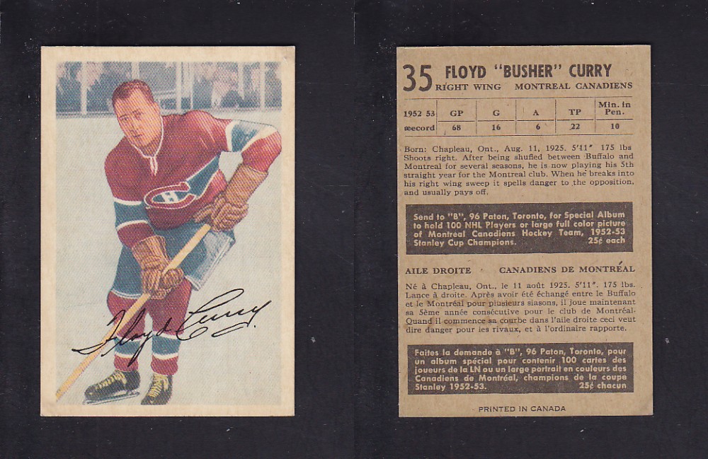 ITEM# : CS71228300 1953-54 PARKHURST HOCKEY CARD #35 B. CURRY DESCRIPTION 1953-54 PARKHURST HOCKEY CARD #35 B. CURRY CONDITION EX NO CREASE PRICE $14.99 USD SHIPPING CANADA RESIDENT 3.00$