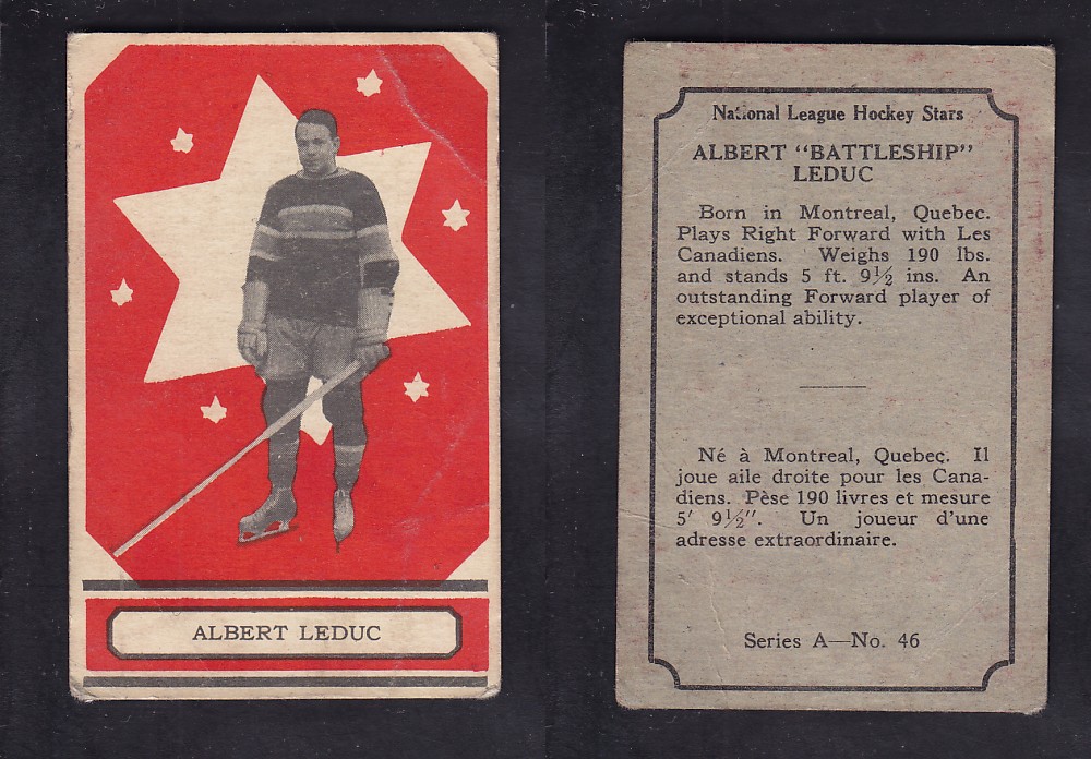 ITEM# : CS71902194 1933-34 O-PEE-CHEE HOCKEY CARD SER. A #46 A. LEDUC DESCRIPTION 1933-34 O-PEE-CHEE HOCKEY CARD SER. A #46 A. LEDUC CONDITION VG CREASES PRICE $59.99 USD SHIPPING CANADA RESIDENT 3.00$