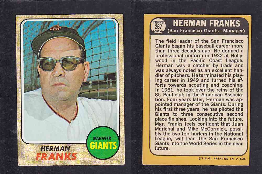 ITEM# : CS72059894 1968 TOPPS BASEBALL CARD #267 H. FRANKS DESCRIPTION 1968 TOPPS BASEBALL CARD #267 H. FRANKS CONDITION EX+ NO CREASE PRICE $1.99 USD SHIPPING CANADA RESIDENT 3.00$