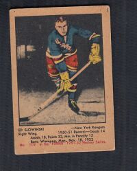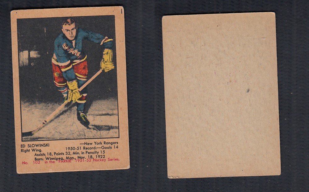 ITEM# : CS72406506 1951-52 PARKHURST HOCKEY CARD #102 E. SLOWINSKI DESCRIPTION 1951-52 PARKHURST HOCKEY CARD #102 E. SLOWINSKI CONDITION EX NO CREASE PRICE $39.99 USD SHIPPING CANADA RESIDENT 3.00$
