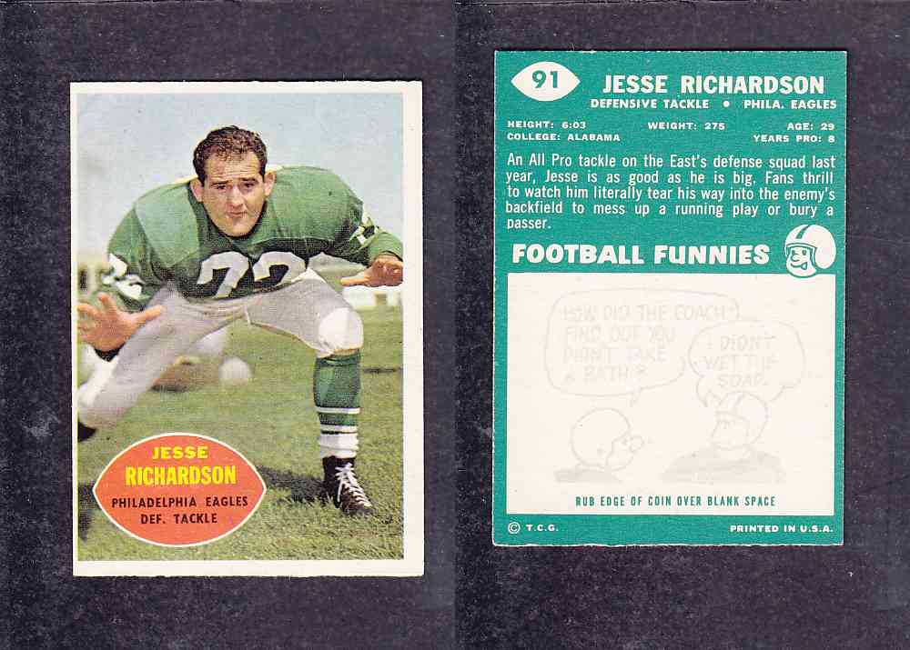 ITEM# : CS73304727 1960 NFL TOPPS FOOTBALL CARD #91 J. RICHARDSON DESCRIPTION 1960 NFL TOPPS FOOTBALL CARD #91 J. RICHARDSON CONDITION NRMINT NO CREASE PRICE $2.99 USD SHIPPING CANADA RESIDENT $3.00