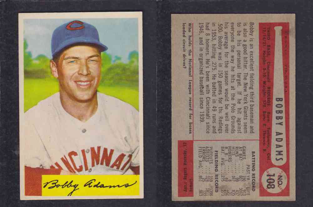 ITEM# : CS73918542 1954 BOWMAN BASEBALL CARD #108 B. ADAMS DESCRIPTION 1955 BOWMAN BASEBALL CARD #108 B. ADAMS CONDITION EX/MINT NO CREASE PRICE $2.99 USD SHIPPING CANADA RESIDENT 3.00$
