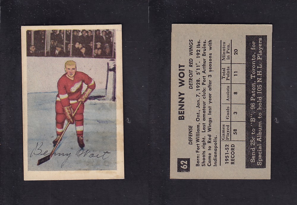 ITEM# : CS74071536 1952-53 PARKHURST HOCKEY CARD #62 B. WOIT DESCRIPTION 1952-53 PARKHURST HOCKEY CARD #62 B. WOIT CONDITION EX NO CREASE PRICE $14.99 USD SHIPPING CANADA RESIDENT 3.00$