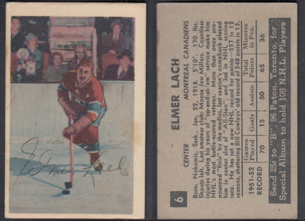 ITEM# : CS76164793 1952-53 PARKHURST HOCKEY CARD #6 E. LACH DESCRIPTION 1952-53 PARKHURST HOCKEY CARD #6 E. LACH CONDITION EX - NO CREASES PRICE $49.99 USD SHIPPING CANADA RESIDENT 3.00$