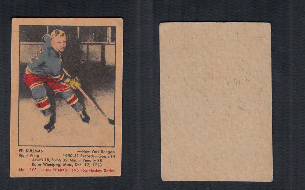 ITEM# : CS77157854 1951-52 PARKHURST HOCKEY CARD #101 E. KULLMAN DESCRIPTION 1951-52 PARKHURST HOCKEY CARD #101 E. KULLMAN CONDITION EX NO CREASE PRICE $39.99 USD SHIPPING CANADA RESIDENT 3.00$