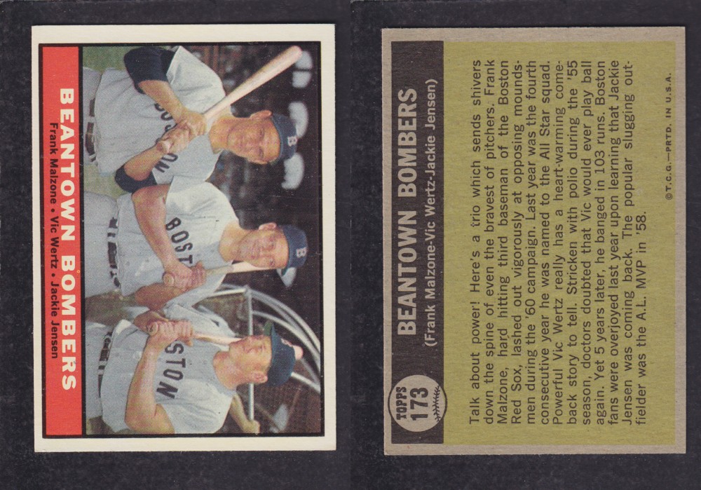 ITEM# : CS77735481 1962 TOPPS BASEBALL CARD #173 BEANTOWN BOMBERS DESCRIPTION 1962 TOPPS BASEBALL CARD #173 BEANTOWN BOMBERS CONDITION NRMINT NO CREASE PRICE $4.99 USD SHIPPING CANADA RESIDENT 3.00$