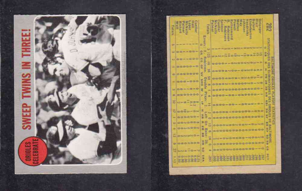 ITEM# : CS78762016 1970 O-PEE-CHEE BASEBALL CARD #202 ORIOLE CELEBRATE DESCRIPTION 1970 O-PEE-CHEE BASEBALL CARD #202 ORIOLE CELEBRATE CONDITION EX/MINT NO CREASE PRICE $1.99 USD SHIPPING CANADA RESIDENT 3.00$