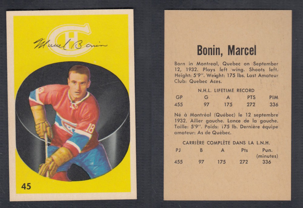 ITEM# : CS81036405 1962-63 PARKHURST HOCKEY CARD #45 M. BONIN DESCRIPTION 1962-63 PARKHURST HOCKEY CARD #45 M. BONIN CONDITION NR MINT - NO CREASES PRICE $24.99 USD SHIPPING CANADA RESIDENT 3.00$
