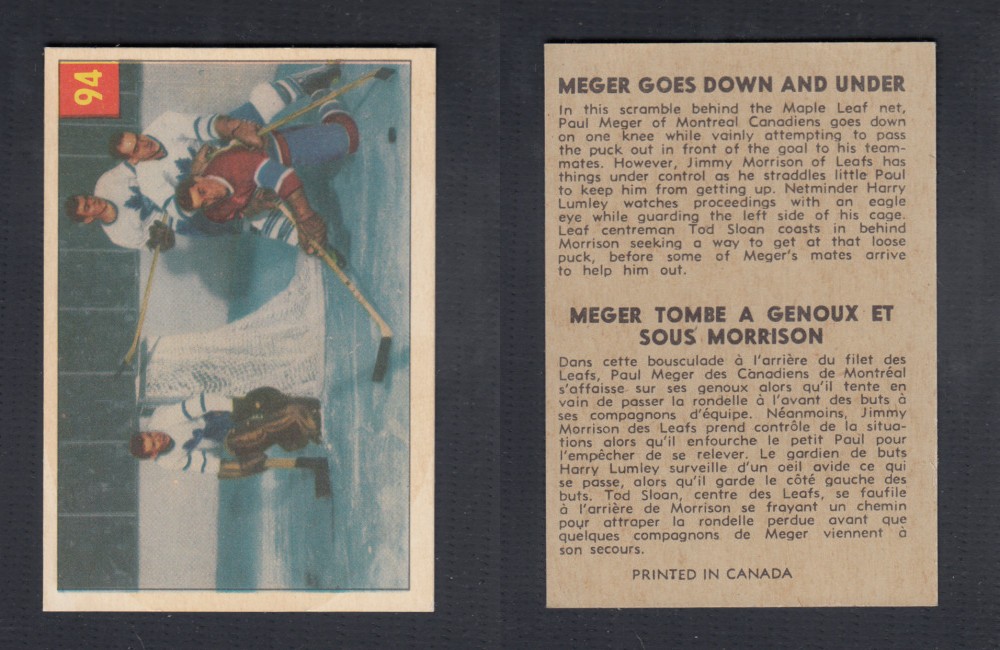 ITEM# : CS81390826 1954-55 PARKHURST HOCKEY CARD #94 MEGER GOES DOWN AND UNDER DESCRIPTION 1954-55 PARKHURST HOCKEY CARD #94 MEGER GOES DOWN AND UNDER CONDITION EX/MINT - NO CREASES PRICE $24.99 USD SHIPPING CANADA RESIDENT 3.00$