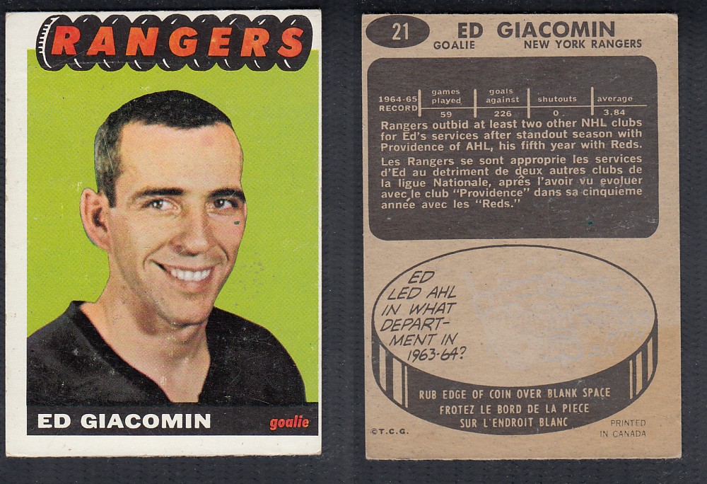 ITEM# : CS82267273 1965-66 TOPPS HOCKEY CARD #21 E. GIACOMIN DESCRIPTION 1965-66 TOPPS HOCKEY CARD #21 E. GIACOMIN CONDITION EX NO CREASE PRICE $99.99 USD SHIPPING CANADA RESIDENT 3.00$