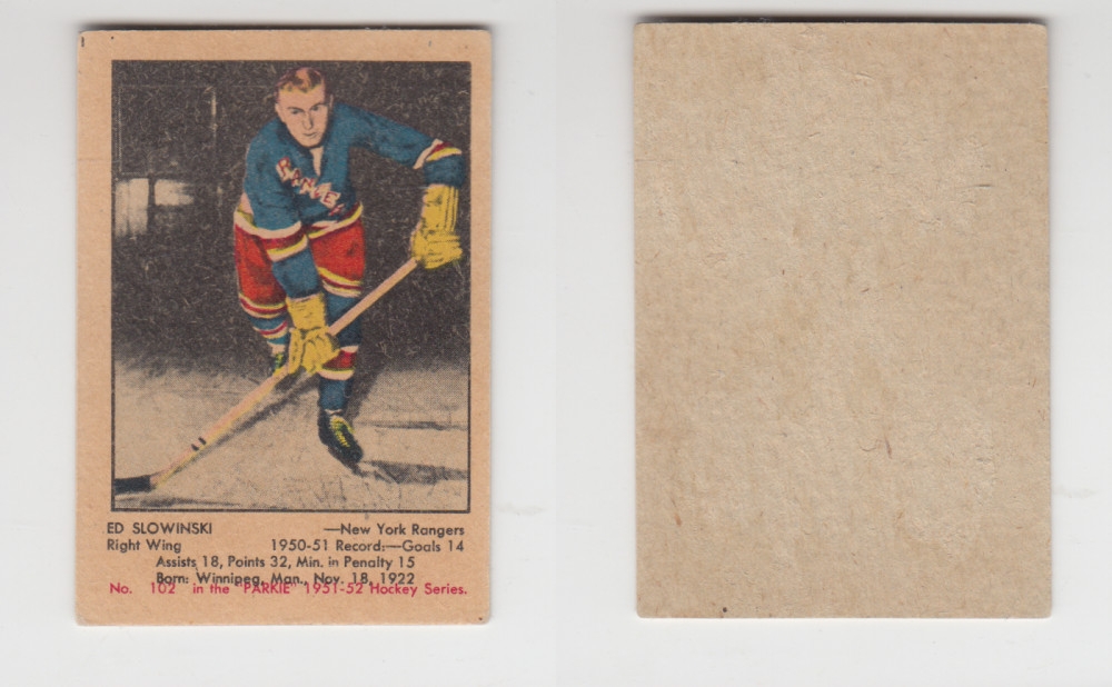 ITEM# : CS86304436 1951-52 PARKHURST HOCKEY CARD #102 E. SLOWINSKI DESCRIPTION 1951-52 PARKHURST HOCKEY CARD #102 E. SLOWINSKI CONDITION EX NO CREASE PRICE $39.99 USD SHIPPING CANADA RESIDENT 3.00$