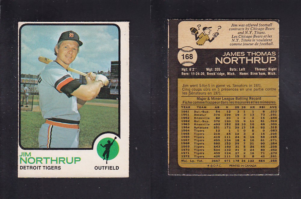 ITEM# : CS87283021 1973 O-PEE-CHEE BASEBALL CARD #168 J. NORTHRUP DESCRIPTION 1973 O-PEE-CHEE BASEBALL CARD #168 J. NORTHRUP CONDITION EX/MINT NO CREASE PRICE $2.99 USD SHIPPING CANADA RESIDENT 3.00$
