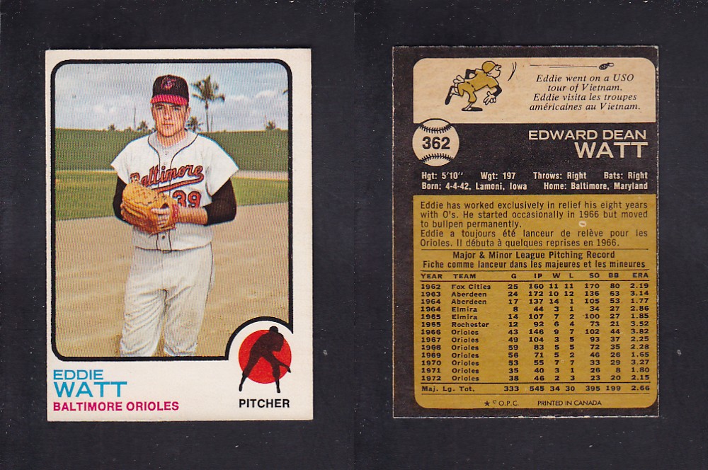 ITEM# : CS87342733 1973 O-PEE-CHEE BASEBALL CARD #362 E. WATT DESCRIPTION 1973 O-PEE-CHEE BASEBALL CARD #362 E. WATT CONDITION NRMINT NO CREASE PRICE $2.99 USD SHIPPING CANADA RESIDENT 3.00$