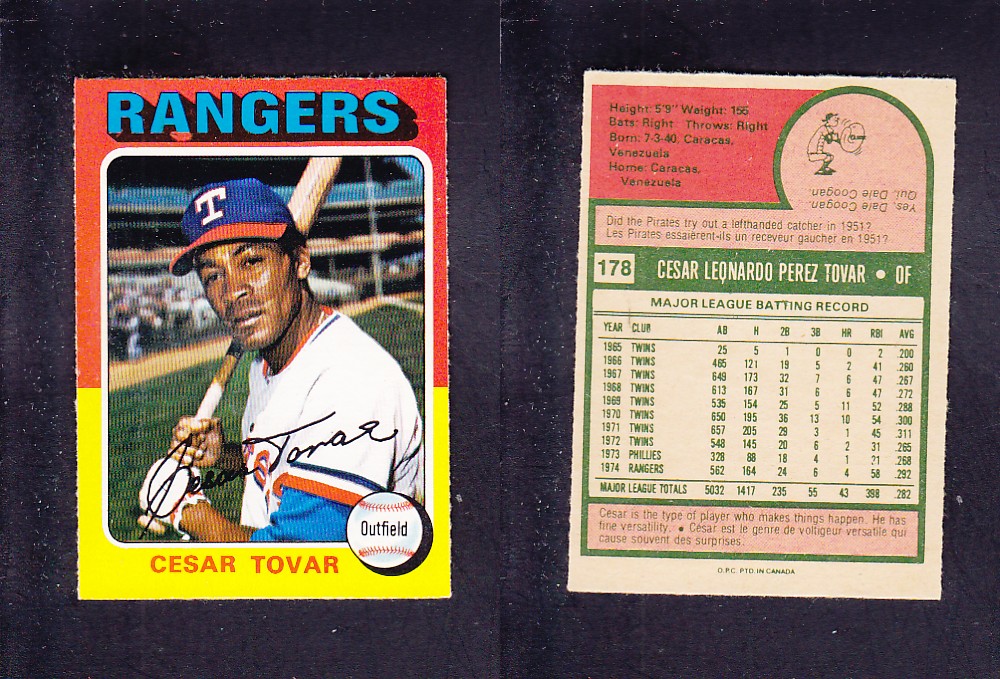 ITEM# : CS88610757 1975 O-PEE-CHEE BASEBALL CARD #178 C. TOVAR DESCRIPTION 1975 O-PEE-CHEE BASEBALL CARD #178 C. TOVAR CONDITION EX/MINT NO CREASE PRICE $2.99 USD SHIPPING CANADA RESIDENT 3.00$