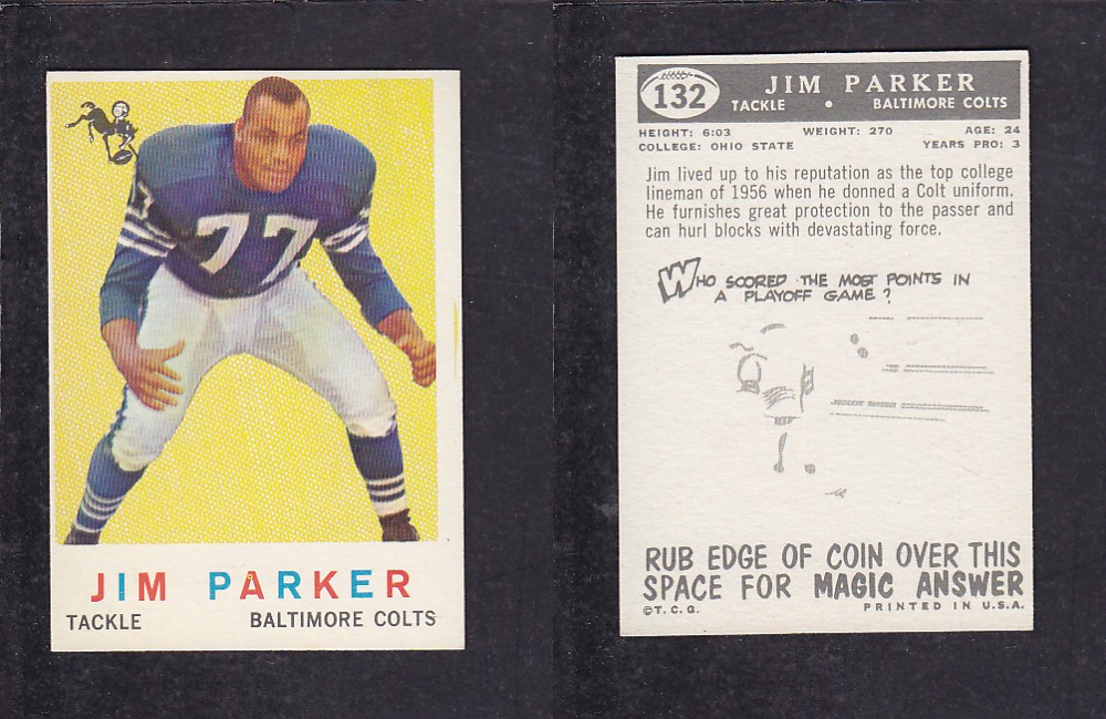 ITEM# : CS89471322 1959 NFL TOPPS FOOTBALL CARD #132 J. PARKER DESCRIPTION 1959 NFL TOPPS FOOTBALL CARD #132 J. PARKER CONDITION EX/MINT NO CREASE PRICE $14.99 USD SHIPPING CANADA RESIDENT $3.00