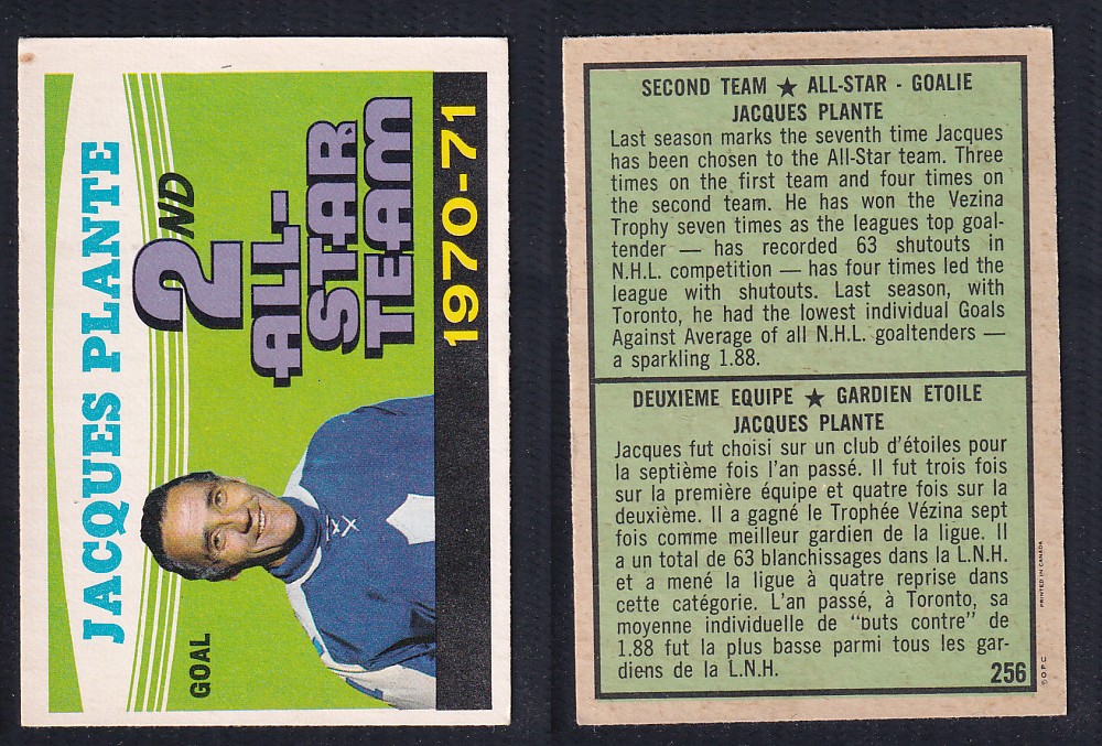 ITEM# : CS89586306 1971-72 O-PEE-CHEE HOCKEY CARD #256 SECOND TEAM ALL STAR: J. PLANTE DESCRIPTION 1971-72 O-PEE-CHEE HOCKEY CARD #256 SECOND TEAM ALL STAR: J. PLANTE CONDITION EX/MINT NO CREASE PRICE $14.99 USD SHIPPING CANADA RESIDENT 3.00$