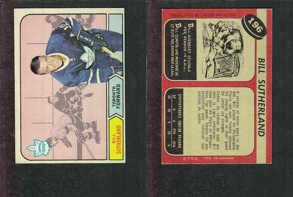 ITEM# : CS89677928 1968-69 O-PEE-CHEE HOCKEY CARD #196 B. SUTHERLAND DESCRIPTION 1968-69 O-PEE-CHEE HOCKEY CARD #196 B. SUTHERLAND CONDITION EX/MINT NO CREASE PRICE $7.99 USD SHIPPING CANADA RESIDENT $3.00