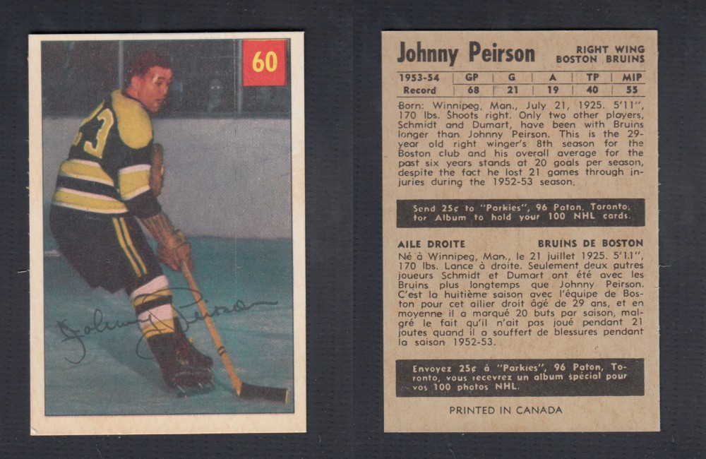 ITEM# : CS90626179 1954-55 PARKHURST HOCKEY CARD #60 J. PEIRSON DESCRIPTION 1954-55 PARKHURST HOCKEY CARD #60 J. PEIRSON CONDITION EX+ - NO CREASES PRICE $24.99 USD SHIPPING CANADA RESIDENT 3.00$