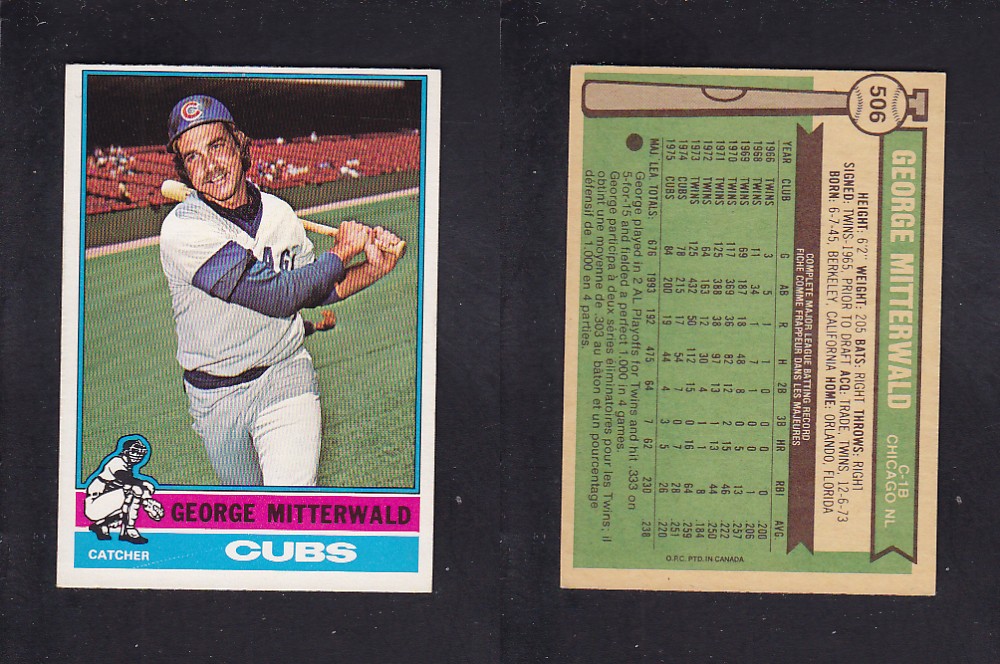 ITEM# : CS90943243 1976 O-PEE-CHEE BASEBALL CARD #506 G. MITTERWALD DESCRIPTION 1976 O-PEE-CHEE BASEBALL CARD #506 G. MITTERWALD CONDITION NRMINT NO CREASE PRICE $2.99 USD SHIPPING CANADA RESIDENT 3.00$