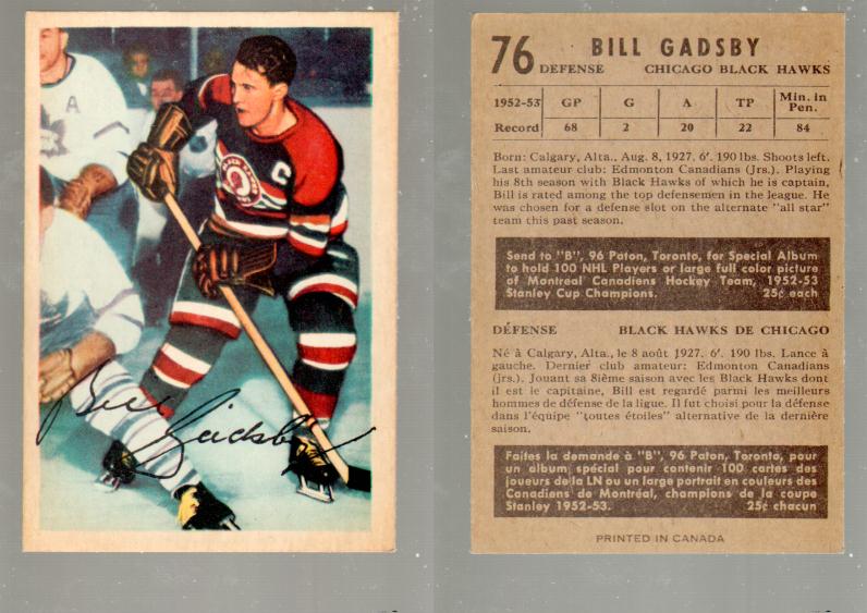 ITEM# : CS93547124 1953-54 PARKHURST HOCKEY CARD #76 B. GADSBY DESCRIPTION 1953-54 PARKHURST HOCKEY CARD #76 B. GADSBY CONDITION EX/MINT NO CREASE PRICE $49.99 USD SHIPPING CANADA RESIDENT $3.00