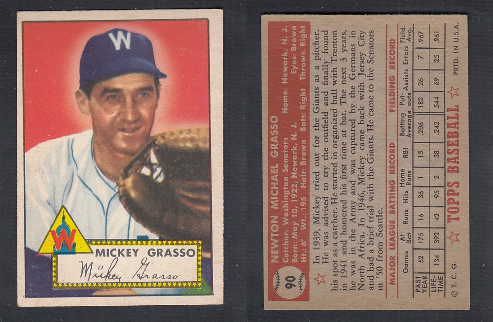 ITEM# : CS94491972 1952 TOPPS BASEBALL CARD #90 M. GRASSO DESCRIPTION 1952 TOPPS BASEBALL CARD #90 M. GRASSO CONDITION EX+ NO CREASE PRICE $19.99 USD SHIPPING CANADA RESIDENT 3.00$
