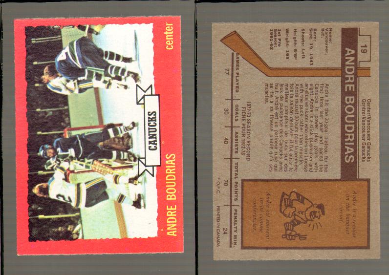 ITEM# : CS97278861 1973-74 O-PEE-CHEE CARD #19 A. BOUDRIAS DESCRIPTION 1973-74 O-PEE-CHEE CARD #19 A. BOUDRIAS CONDITION EX/MINT NO CREASE PRICE $2.99 USD SHIPPING CANADA RESIDENT $3.00
