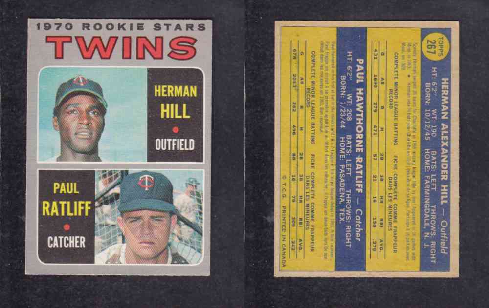 ITEM# : CS97798134 1970 O-PEE-CHEE BASEBALL CARD #267 ROOKIE STARS TWINS DESCRIPTION 1970 O-PEE-CHEE BASEBALL CARD #267 ROOKIE STARS TWINS CONDITION VG 1 SURFACE CREASE PRICE $1.99 USD SHIPPING CANADA RESIDENT 3.00$