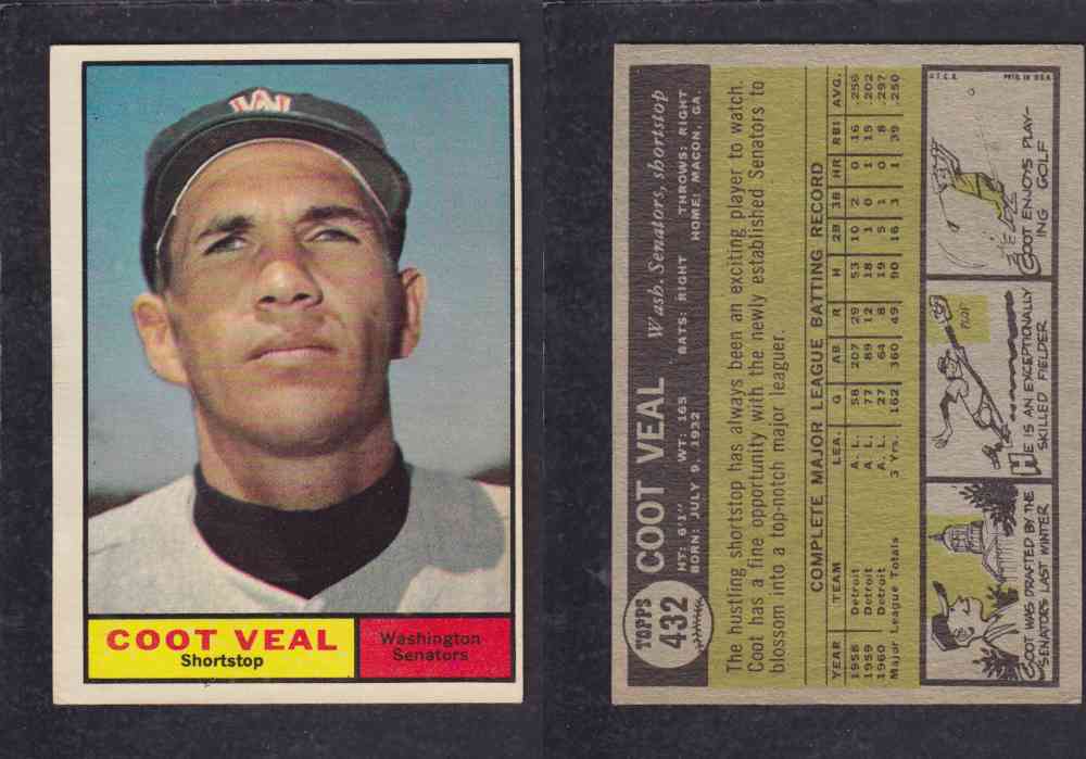 ITEM# : CS97972078 1961 TOPPS BASEBALL CARD #432 C. VEAL DESCRIPTION 1961 TOPPS BASEBALL CARD #432 C. VEAL CONDITION EX/MINT NO CREASE PRICE $1.99 USD SHIPPING CANADA RESIDENT 3.00$