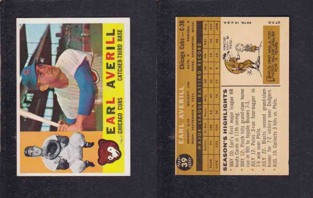 ITEM# : CS98261596 1960 TOPPS BASEBALL CARD #39 E AVERILL DESCRIPTION 1960 TOPPS BASEBALL CARD #39 E AVERILL CONDITION NRMINT NO CREASE PRICE $2.99 USD SHIPPING CANADA RESIDENT 3.00$