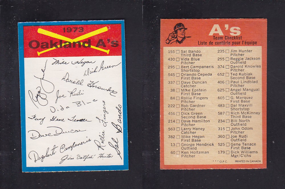 ITEM# : CS11610963 1973 O-PEE-CHEE BASEBALL CARD TEAM CHECKLISTS OAKLAND A'S DESCRIPTION 1973 O-PEE-CHEE BASEBALL CARD TEAM CHECKLISTS OAKLAND A'S CONDITION NRMINT NO CREASE PRIX $4.99 USD EXPÉDITION CANADA RESIDENT 3.00$