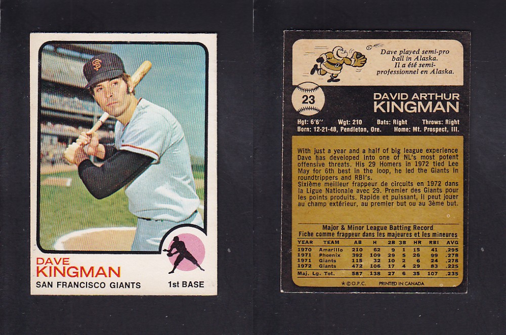 ITEM# : CS13753329 1973 O-PEE-CHEE BASEBALL CARD #23 D. KINGMAN DESCRIPTION 1973 O-PEE-CHEE BASEBALL CARD #23 D. KINGMAN CONDITION NRMINT NO CREASE PRIX $2.99 USD EXPÉDITION CANADA RESIDENT 3.00$