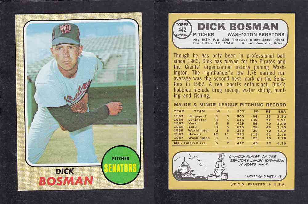 ITEM# : CS18260670 1968 TOPPS BASEBALL CARD #442 D. BOSMAN DESCRIPTION 1968 TOPPS BASEBALL CARD #442 D. BOSMAN CONDITION EX/MINT NO CREASE PRIX $1.99 USD EXPÉDITION CANADA RESIDENT 3.00$
