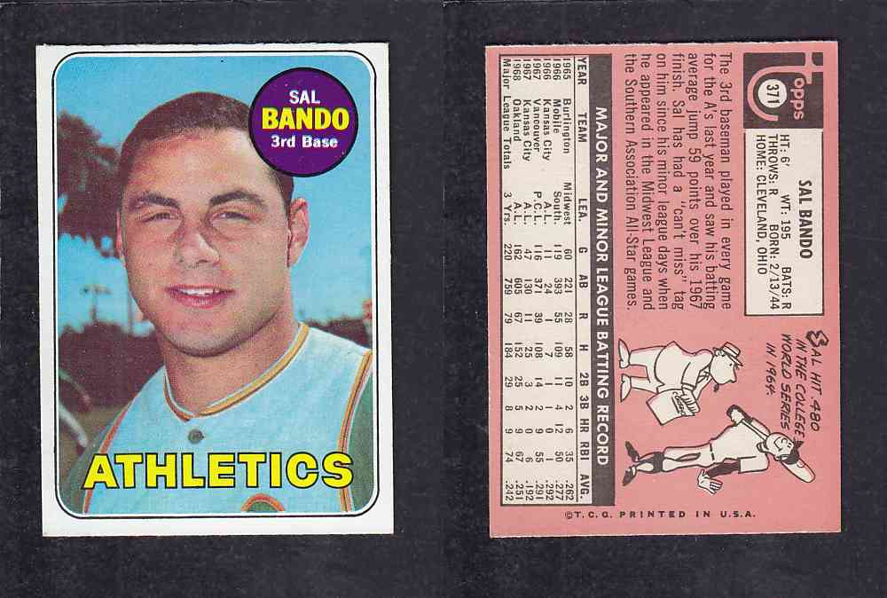ITEM# : CS28547418 1969 TOPPS BASEBALL CARD #371 M. BANDO DESCRIPTION 1969 TOPPS BASEBALL CARD #371 M. BANDO CONDITION EX+ NO CREASE PRIX $1.99 USD EXPÉDITION CANADA RESIDENT 3.00$