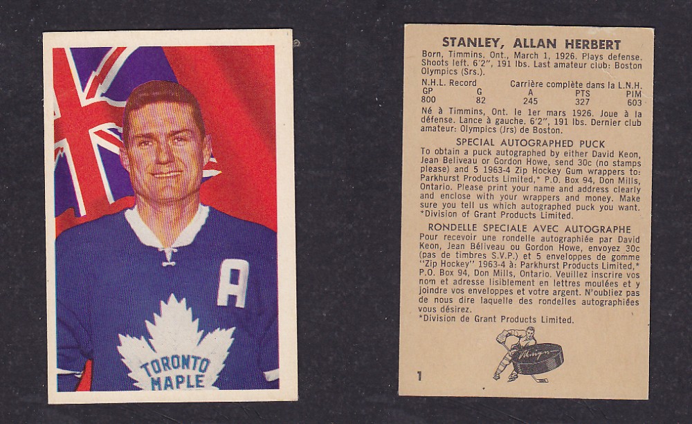ITEM# : CS28557022 1963-64 PARKHURST HOCKEY CARD #1 A. STANLEY DESCRIPTION 1963-64 PARKHURST HOCKEY CARD #1 A. STANLEY CONDITION EX/MINT NO CREASE PRIX $19.99 USD EXPÉDITION CANADA RESIDENT 3.00$