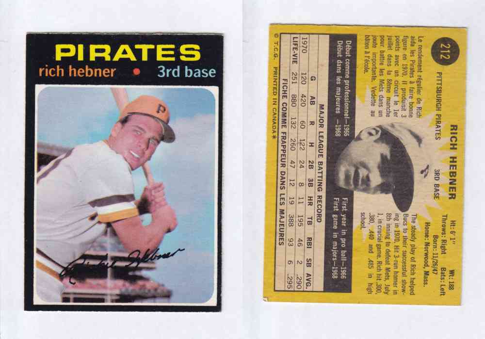 ITEM# : CS29453054 1971 O-PEE-CHEE BASEBALL CARDS #212 R. HEBNER DESCRIPTION 1971 O-PEE-CHEE BASEBALL CARDS #212 R. HEBNER CONDITION EX/MINT NO CREASE PRIX $2.99 USD EXPÉDITION CANADA RESIDENT 3.00$