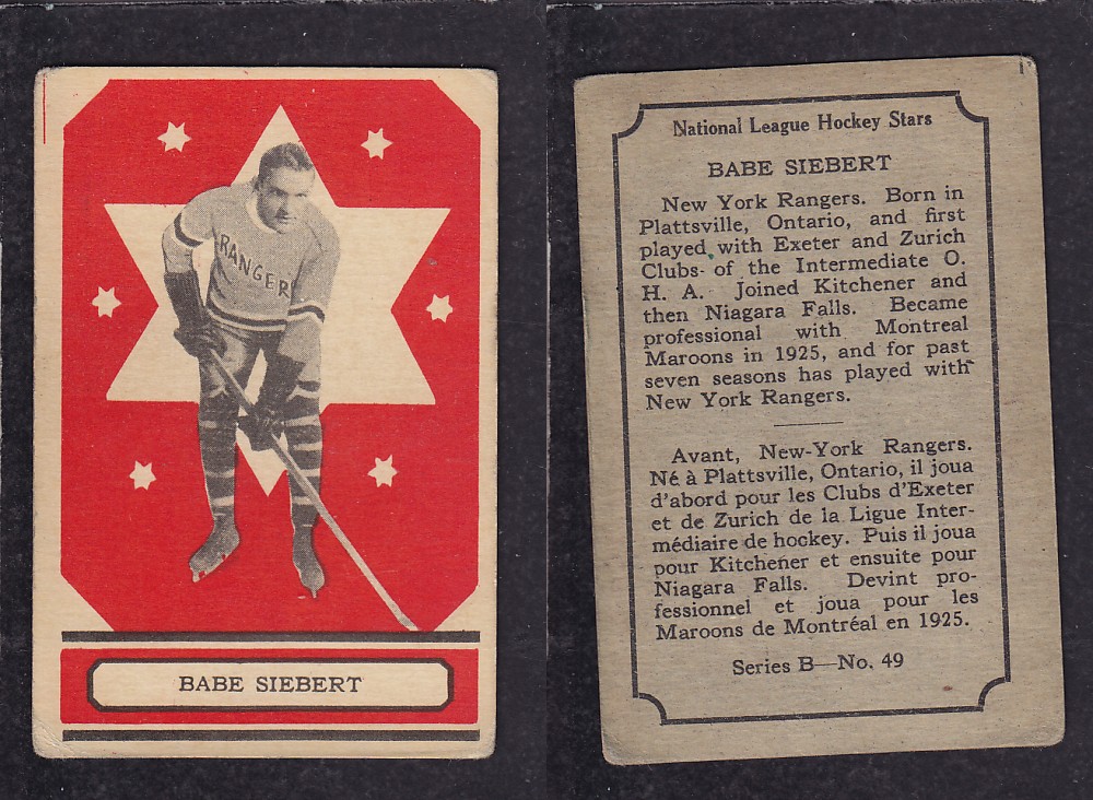 ITEM# : CS35732856 1933-34 O-PEE-CHEE HOCKEY CARD #49 B. SIEBERT DESCRIPTION 1933-34 O-PEE-CHEE HOCKEY CARD #49 B. SIEBERT CONDITION VG NO CREASES PRIX $199.99 USD EXPÉDITION CANADA RESIDENT 3.00$