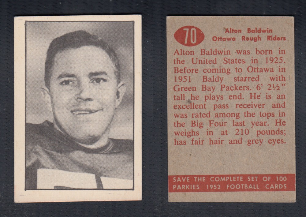 ITEM# : CS37828384 1952 CFL PARKHURST FOOTBALL CARD #70 A. BALDWIN DESCRIPTION 1952 CFL PARKHURST FOOTBALL CARD #70 A. BALDWIN CONDITION EX