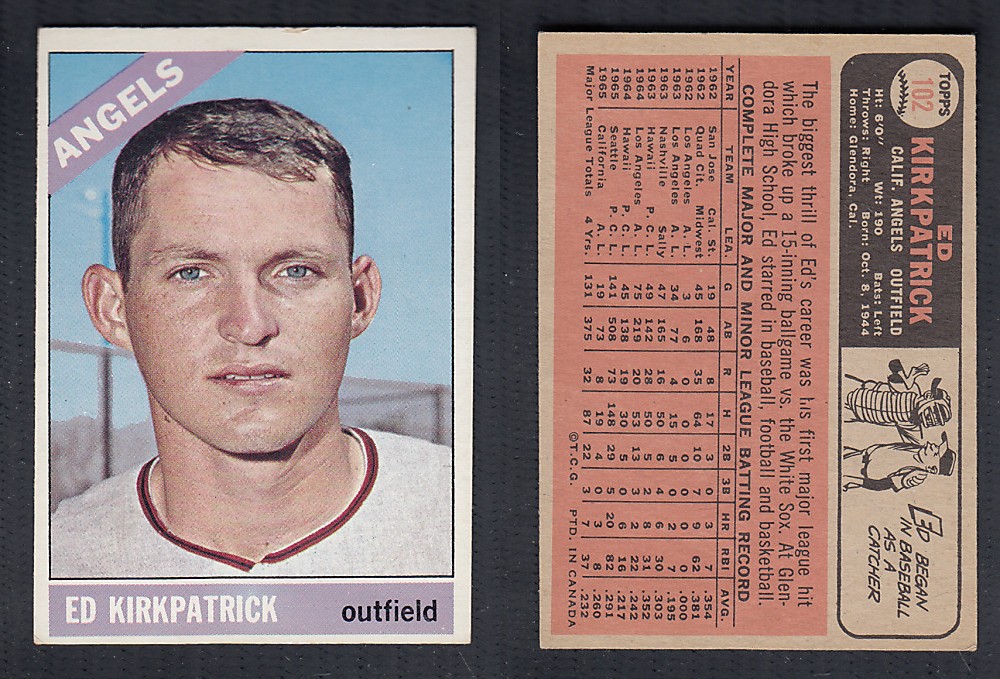 ITEM# : CS39944696 1966 O-PEE-CHEE BASEBALL CARD #102 E. KIRKPATRICK DESCRIPTION 1966 O-PEE-CHEE BASEBALL CARD #102 E. KIRKPATRICK CONDITION EX+