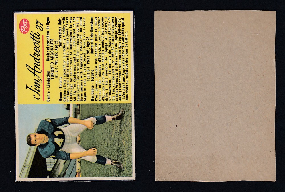 ITEM# : CS44999287 1963 CFL POST FOOTBALL CARD #37 J. ANDREOTTI DESCRIPTION 1963 CFL POST FOOTBALL CARD #37 J. ANDREOTTI CONDITION HAND CUT PRIX $4.99 USD EXPÉDITION CANADA RESIDENT 3.00$