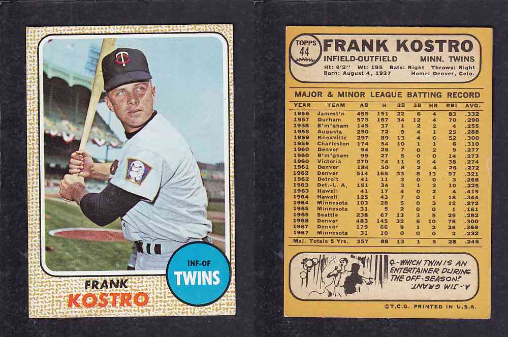 ITEM# : CS53941154 1968 TOPPS BASEBALL CARD #44 F. KOSTRO DESCRIPTION 1968 TOPPS BASEBALL CARD #44 F. KOSTRO CONDITION EX+ NO CREASE PRIX $1.99 USD EXPÉDITION CANADA RESIDENT 3.00$