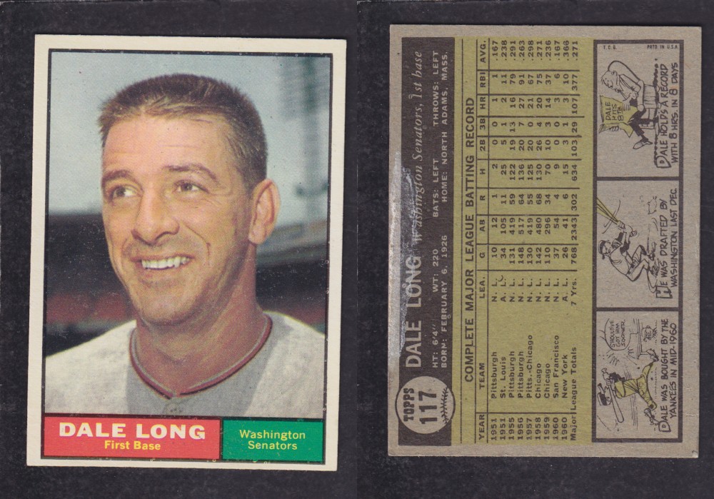 ITEM# : CS58140195 1962 TOPPS BASEBALL CARD #117 D. LONG DESCRIPTION 1962 TOPPS BASEBALL CARD #117 D. LONG CONDITION EX/MINT NO CREASE PRIX $1.99 USD EXPÉDITION CANADA RESIDENT 3.00$
