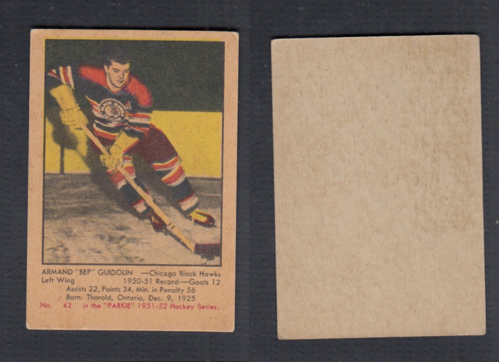 ITEM# : CS61334999 1951-52 PARKHURST HOCKEY CARD #42 A. GUIDOLIN DESCRIPTION 1951-52 PARKHURST HOCKEY CARD #42 A. GUIDOLIN CONDITION EX - NO CREASES PRIX $49.99 USD EXPÉDITION CANADA RESIDENT 3.00$