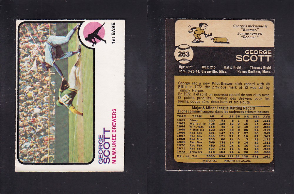 ITEM# : CS76134527 1973 O-PEE-CHEE BASEBALL CARD #263 G. SCOTT DESCRIPTION 1973 O-PEE-CHEE BASEBALL CARD #263 G. SCOTT CONDITION EX/MINT NO CREASE PRIX $2.99 USD EXPÉDITION CANADA RESIDENT 3.00$